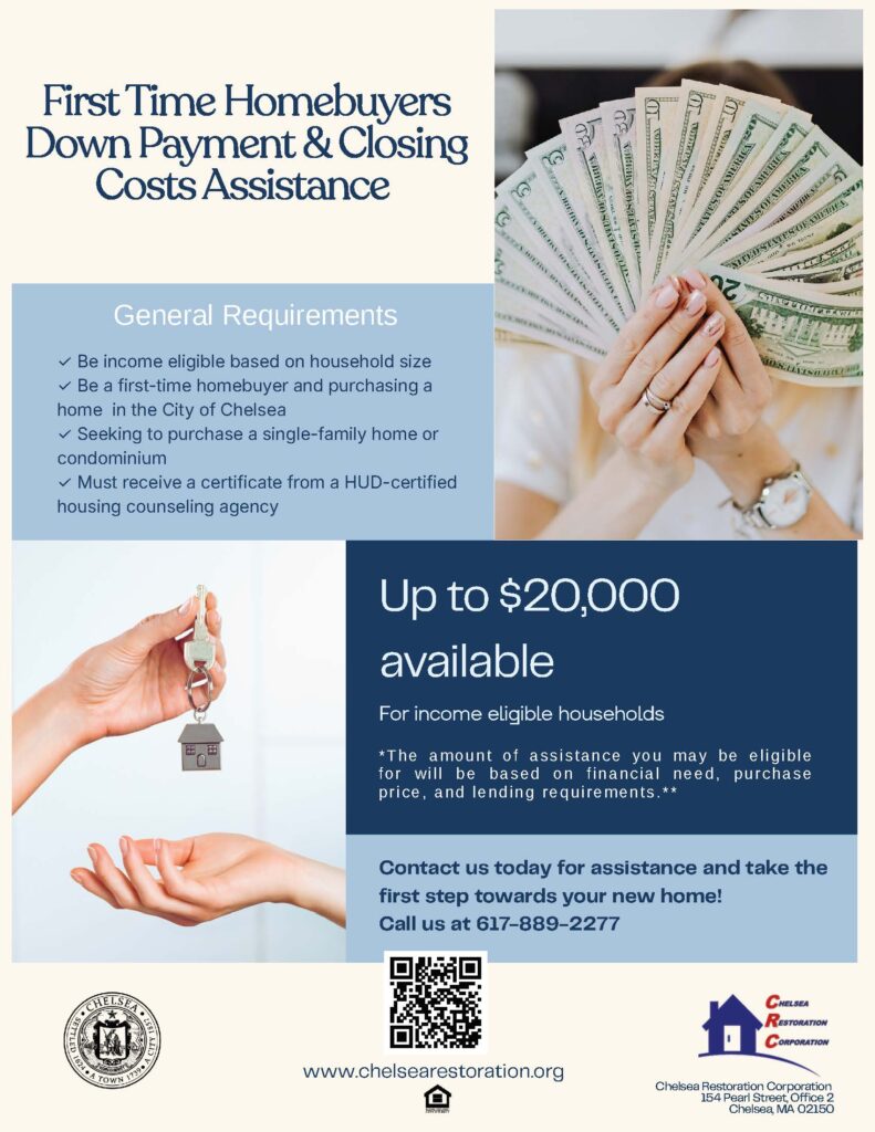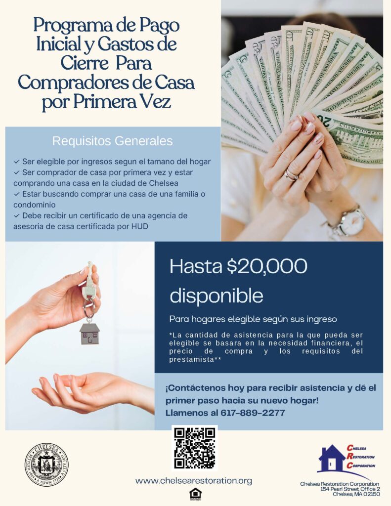 Dé el primer paso hacia la compra de su hogar con el apoyo de la Ciudad de Chelsea y Chelsea Restoration Corporation (CRC). Estamos aquí para ayudarle a hacer realidad su sueño de ser propietario en Chelsea.