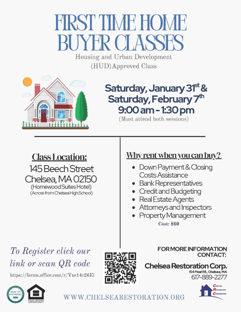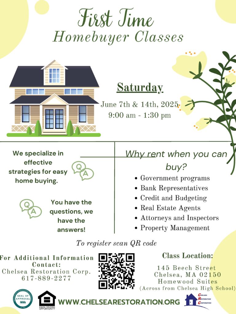 Chelsea Restoration Corporation provides homebuyer education, pre-purchase counseling, and down payment assistance programs (in English and Spanish), and our home restoration programs have rehabilitated several blighted properties. All of our programs promote local home ownership and help low-to-moderate income individuals and families achieve their dream of home ownership.